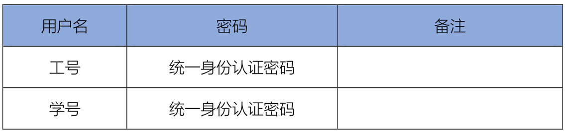 大厅均使用统一身份认证账号和密码。教职工为工号,学生为学号,切勿