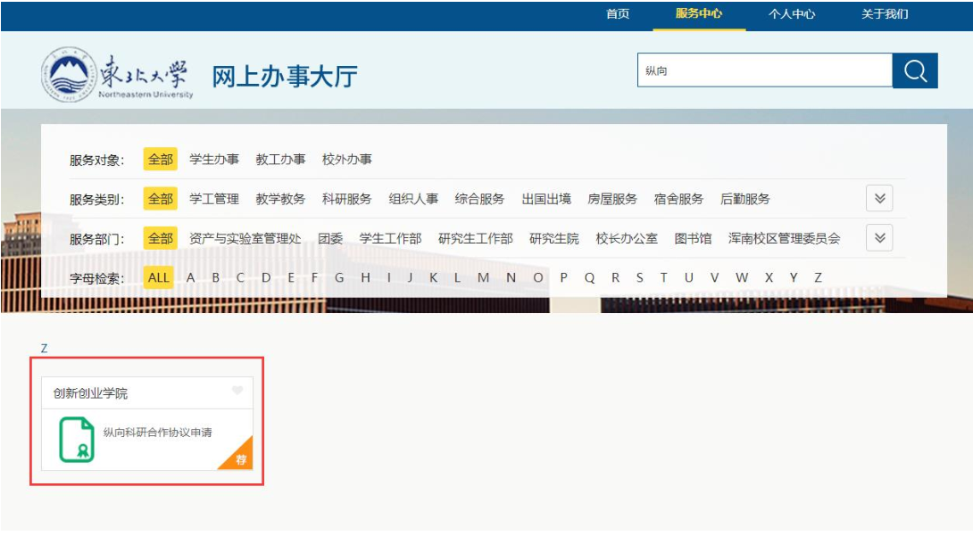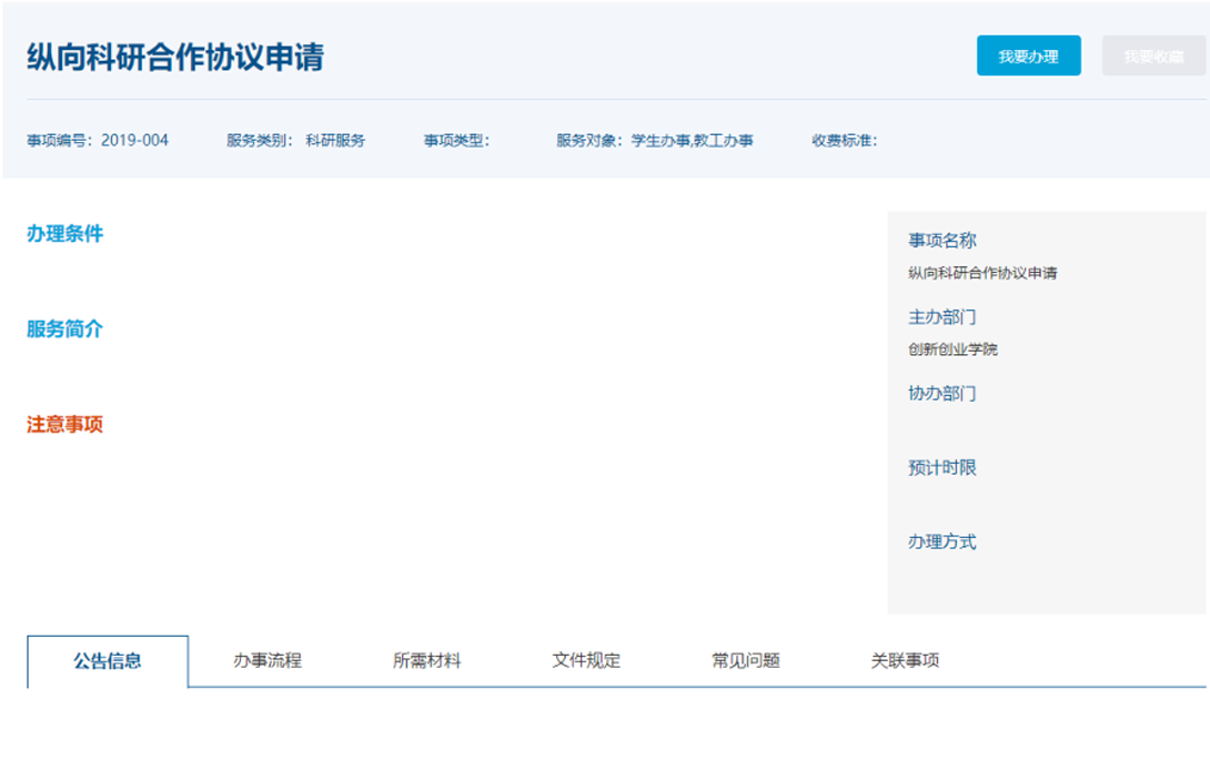 将以“纵向科研合作协议申请”服务为例,对发起该事项流程的操作步骤进行 详细说明。